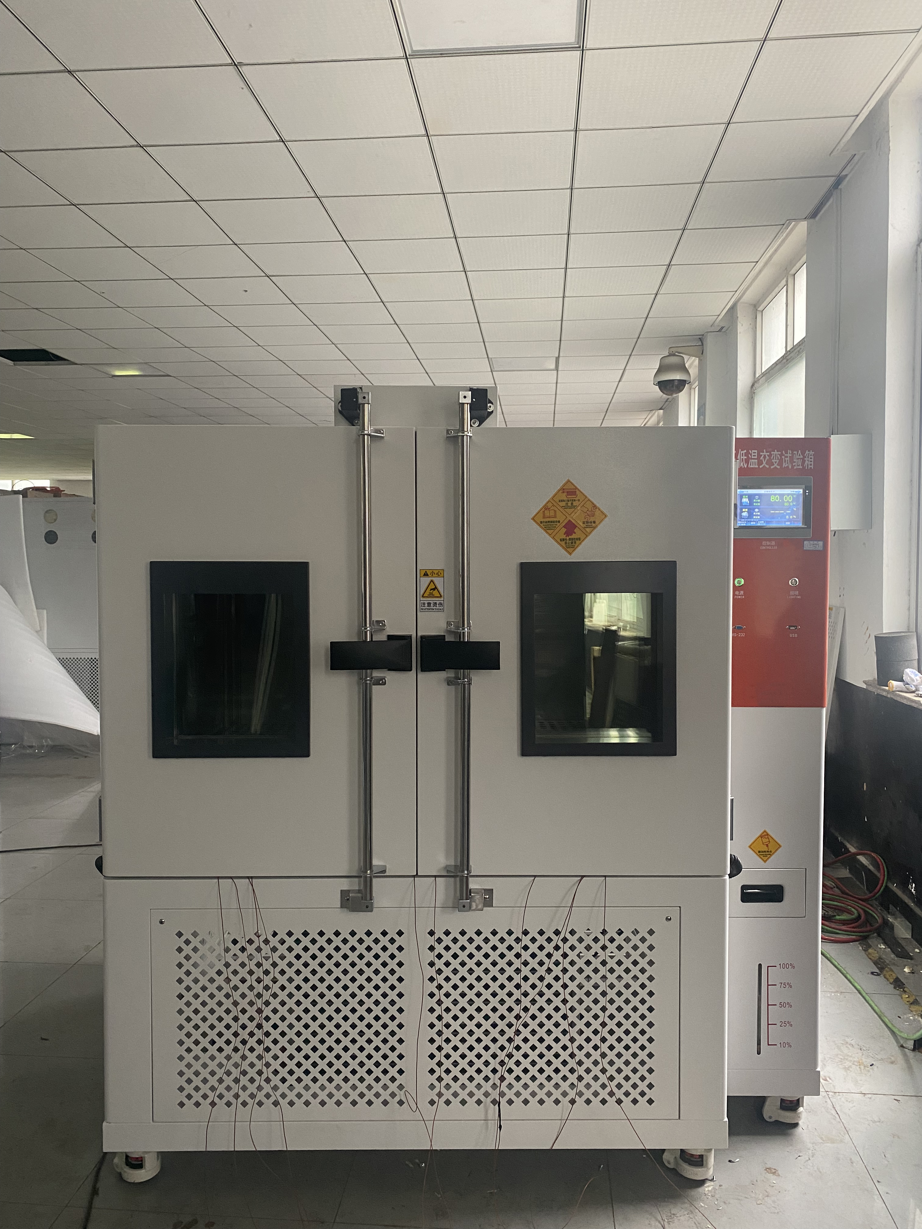 此次秀強玻璃工藝股份有限公司與我們合作,采購高低溫交變濕熱試驗箱672L,-40℃-150℃,做定制雙開門款,下為設備交貨前調試圖: