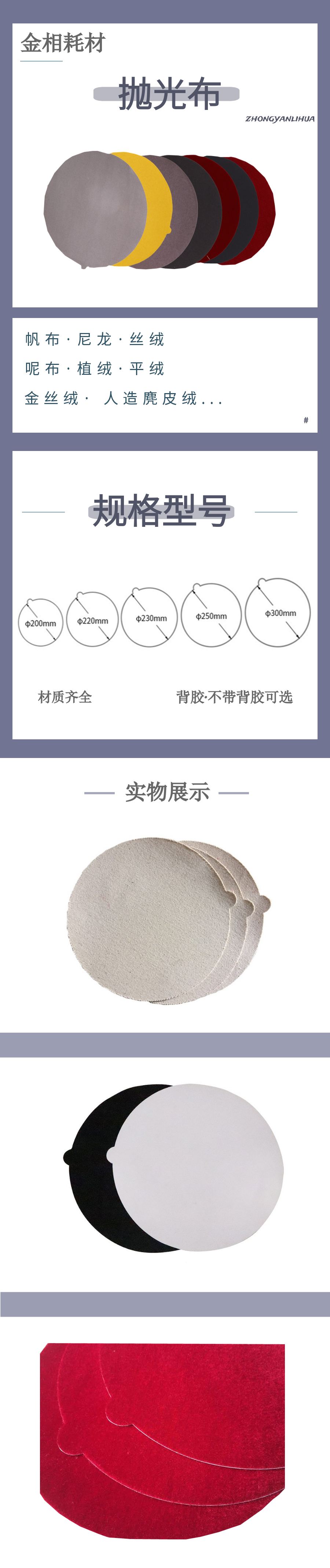 用途:金相拋光織物專門作為實驗耗材用于金相分析測試。能對金相制樣進行粗拋和精拋,還可以廣泛適用于半自動或全自動金相拋光機,光學(xué)、電子、半導(dǎo)體、硅、電腦硬盤、陶瓷等高精密表面拋光