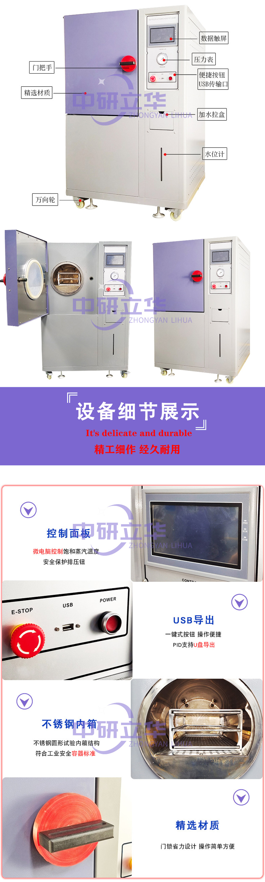 2.圓幅內(nèi)襯,不銹鋼圓幅型內(nèi)襯設(shè)計,可避免蒸氣潛熱直接沖擊試品
